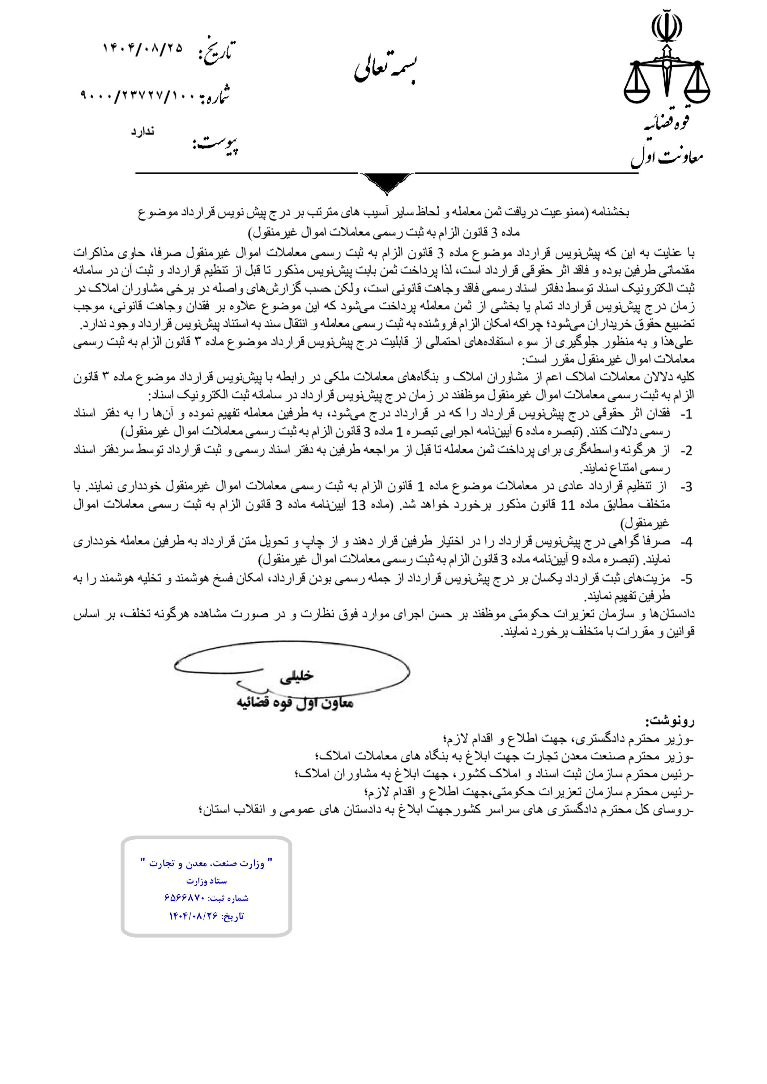 بخشـــنامه ممنوعــــیت دریافت ثــمــن مـعــامــلــ